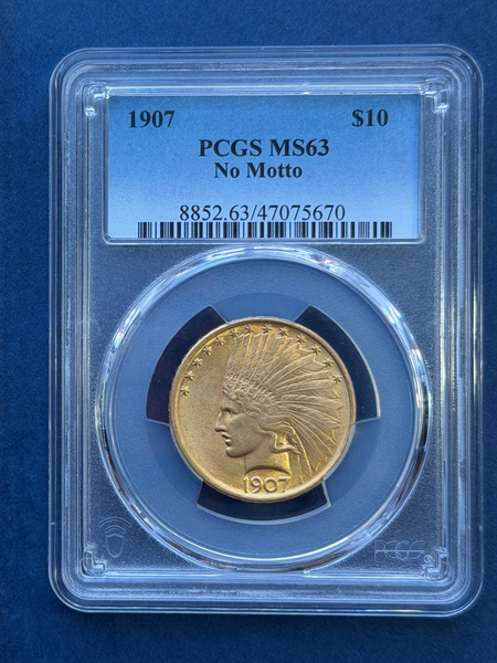Certified by PCGS with a high-grade MS63, this 1907 No Motto $10 Gold Indian Eagle is a valuable and sought-after addition to any coin collection. The PCGS Certification number 8852.63/47075670 adds to its authenticity and rarity. Invest in a piece of history today!