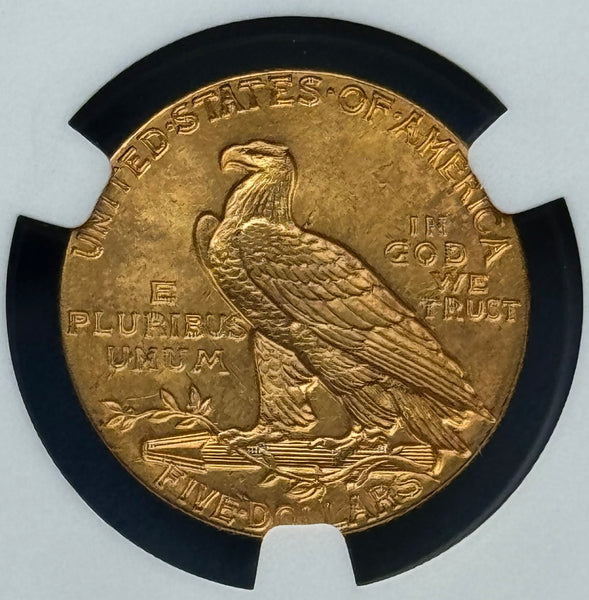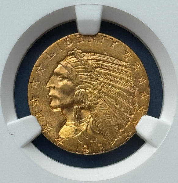 This 1913 $5 Indian Head Half Eagle is a rare and valuable addition to any coin collection. With its beautiful design and high grade of MS 63, this coin is sure to impress. The coin is made of gold with a fineness of 0.9 and was minted in Philadelphia.