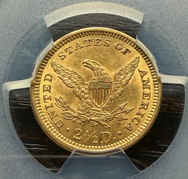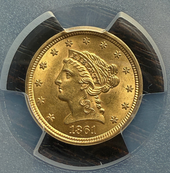 The 1861 $2.50 Gold Liberty Quarter Eagle PCGS MS63 Shield New Reverse is a rare and highly sought-after coin, distinguished by its low population in this grade. Featuring the classic Liberty design with the Shield New Reverse, this piece exemplifies exceptional preservation and sharp detail. Its scarcity at MS63 makes it a valuable addition for serious collectors seeking quality and historical significance in early American gold coinage.